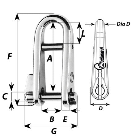 Ø08 : Charge de travail (kg) : 800 / Charge de rupture (kg) : 2500 / Poids : 123 g / Dimensions : A : 59 mm B : 21 mm C : 8 mm D : 17 mm (Diamètre du manillon : 8 mm) E : 6 mm F : 79 mm G : 49 mm L : 20 mm